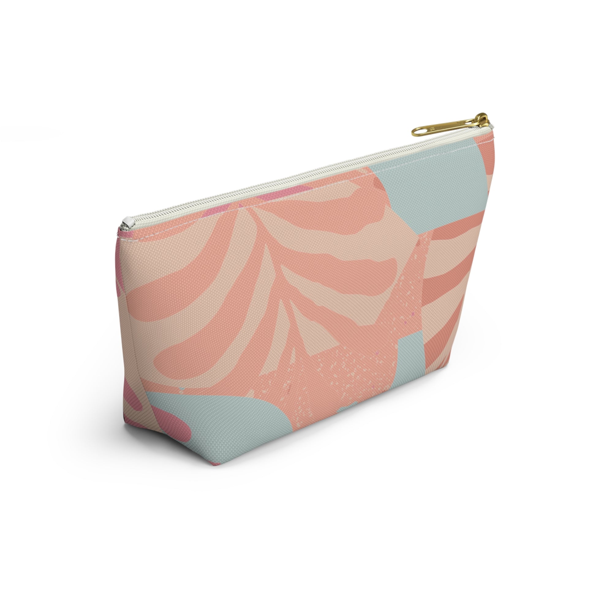 A cheerful accessory pouch that carries your small essentials with relaxed, vintage-inspired style. Soft, spun polyester holds the pastel abstract print — blush pinks, warm corals and cool mint — without wrinkling, while a gold-color zipper adds a subtle, luxe touch. The roomy T-bottom gives structure so brushes, chargers, and everyday bits sit neatly inside. Lightweight and durable, this pouch slips into a tote or beach bag and feels like a little pocket of calm color for days full of errands, travel, or creative work.